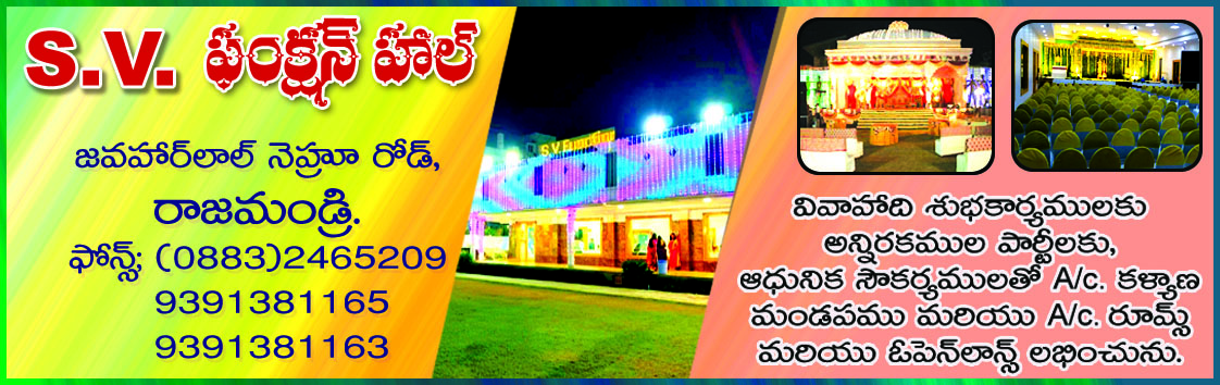 Conveniently located in the heart of Rajahmundry, S.V. Function Hall offers easy accessibility and ample parking facilities, making it a preferred choice for both local residents and out-of-town guests. Additionally, the hall’s strategic location ensures proximity to hotels, transportation hubs, and other amenities, further enhancing the convenience factor for event organizers and attendees alike.