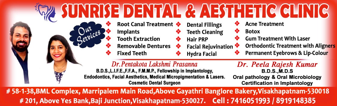 **”Sunrise Dental & Aesthetic Clinic is one of the leading dental clinics in Vizag, known for combining advanced dental care with modern aesthetic treatments. Our team of experienced dentists and specialists provide personalized solutions to keep your teeth healthy and your smile confident.