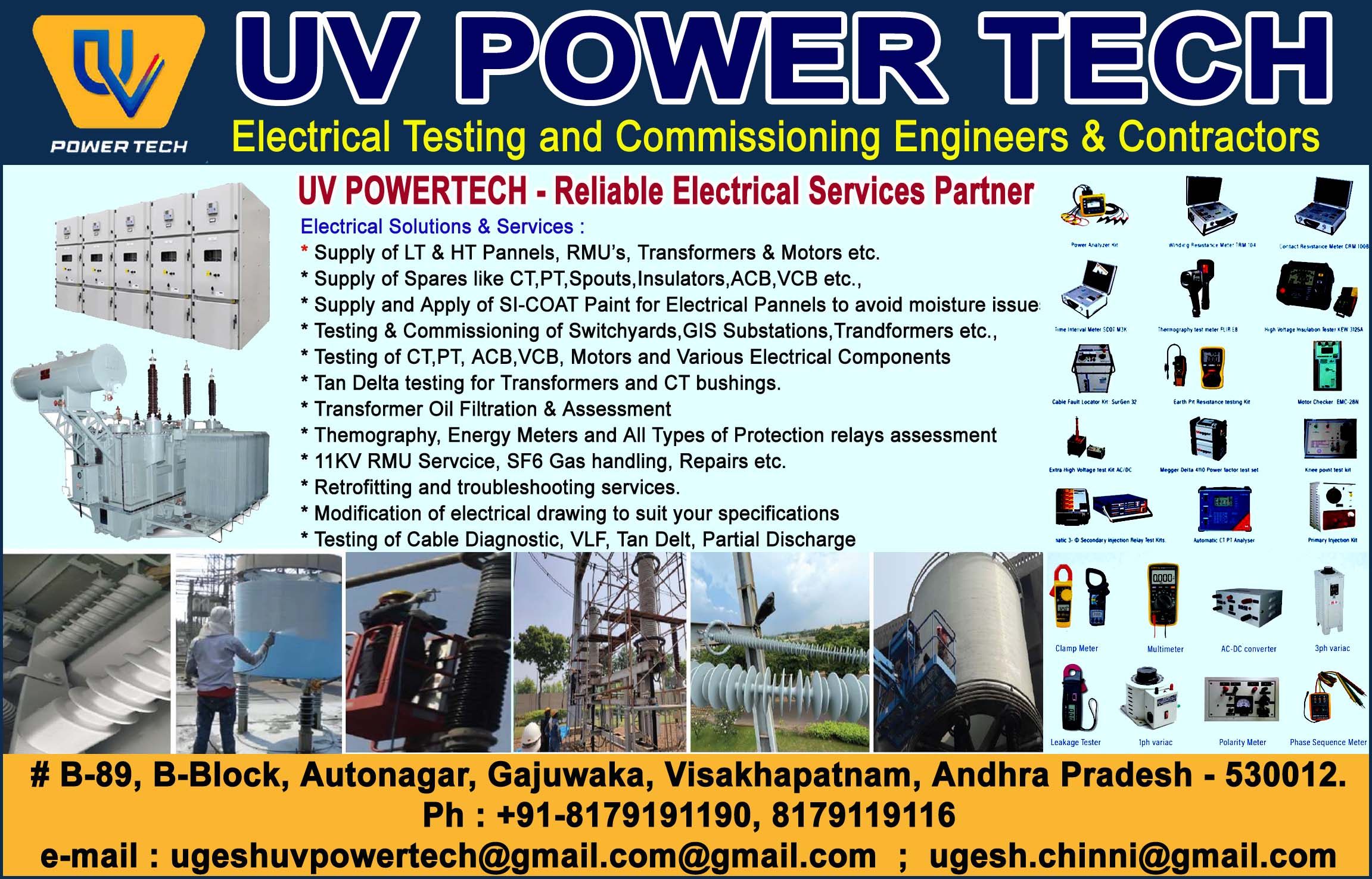 UV Power Tech, Visakhapatnam based engineering company has earned a prime place in electrical industry at Visakhapatnam and was established over past 5 years at and operating centrally from Anakapalli and Gajuwaka . It is a leading service provider in the Testing and Commissioning of Electrical systems.