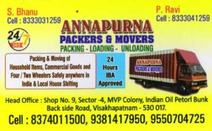 Annapurna packers and movers l Best l professional l car carrier l IBA approved l Wearhouse l mini transport l vizag l Visakhapatnam l Mvp colony l sivajipalem l Arilova l Lawsons bay colony l Seethamadhara l Arilova l ramnagar l Sagarnagar l endada l pm palem.